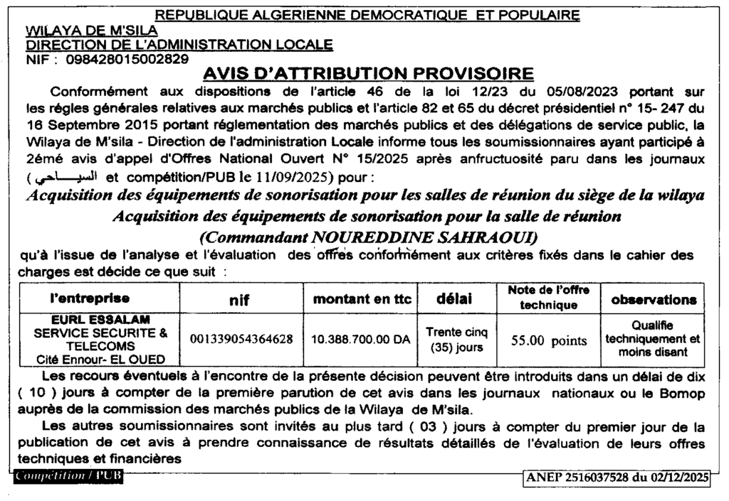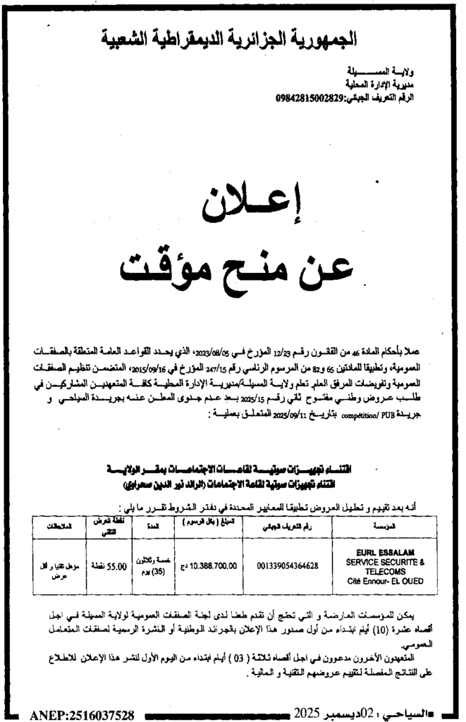 إعلان عن منح مؤقت اقتناء تجهيزات صوتية لقاعات الاجتماعات بمقر الولاية/ مديرية الادارة المحلية لولاية المسيلة