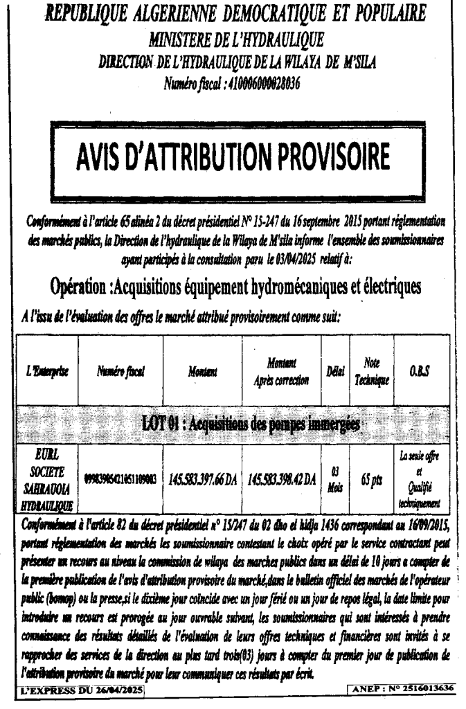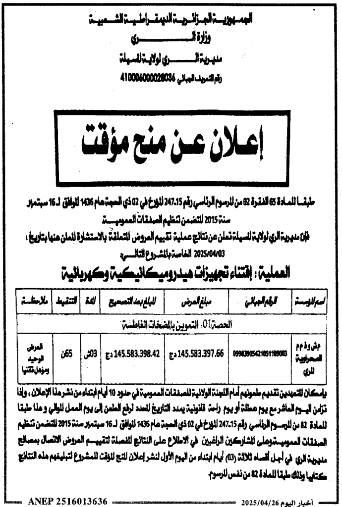 إعلان عن منح مؤقت اقتناء تجهيزات هيدروميكانيكة وكهربائية/ مديرية الري لولاية المسيلة