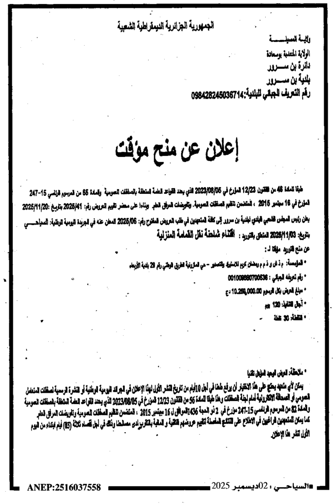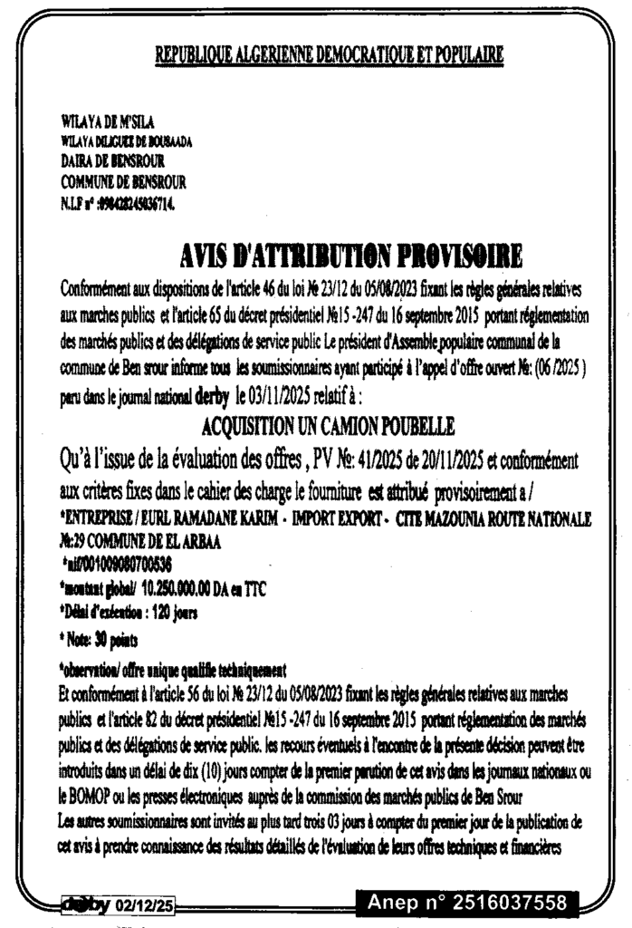 إعلان عن منح مؤقت اقتناء شاحنة نقل القمامة المنزلية/ بلدية بن سرور