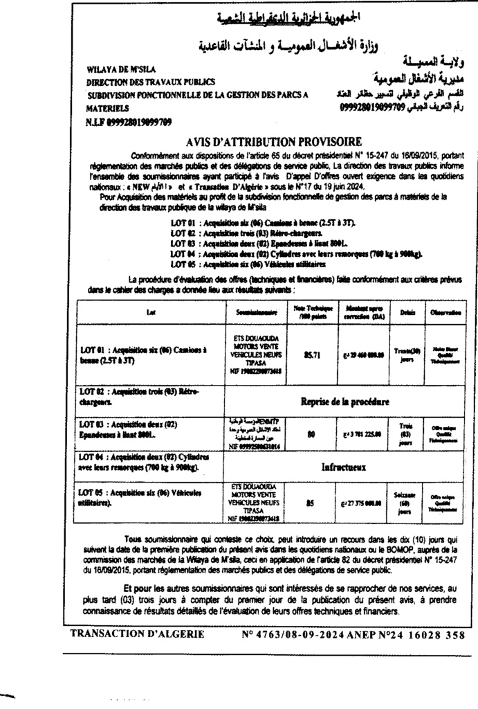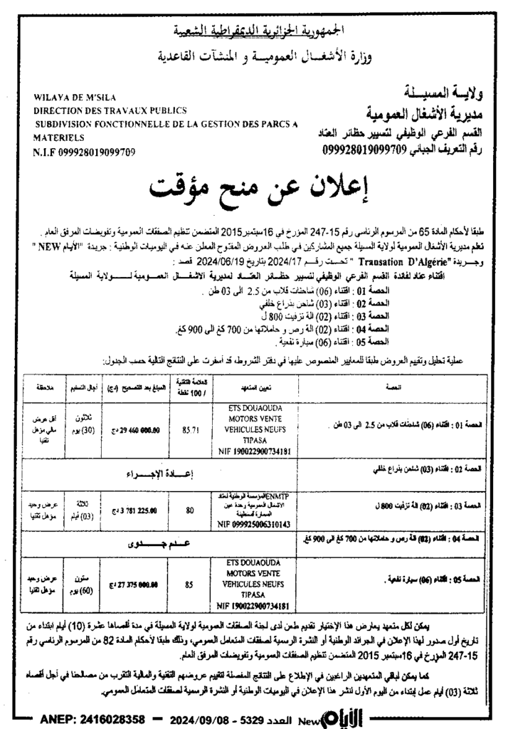 إعلان عن منح مؤقت اقتناء عتاد لفائدة القسم الفرعي لتسيير حظائر العتاد / مديرية الأشغال العمومية لولاية المسيلة