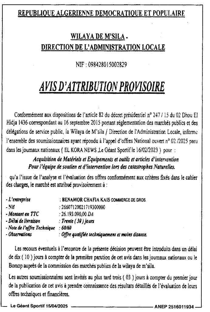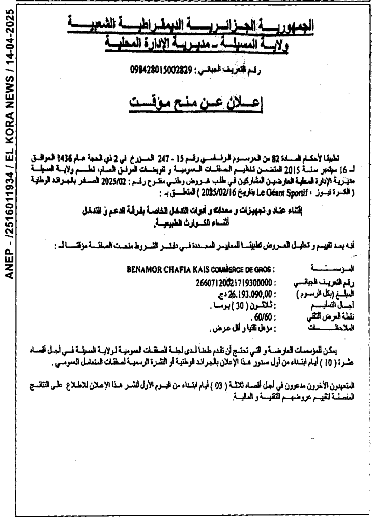 اقتناء عتاد وتجهيزات ومعدات وأدوات التدخل الخاصة بفرقة الدعم والتدخل أثناء الكوارث الطبيعية14 أبريل، 20250 11 شاركها فيسبوك X مشاركة عبر البريد طباعة