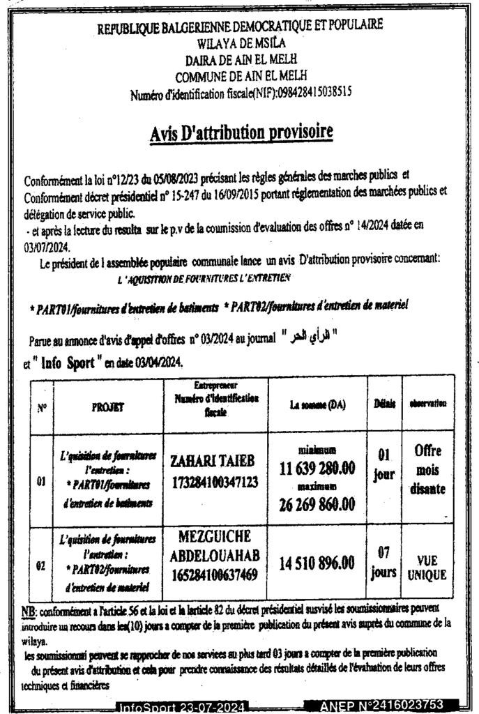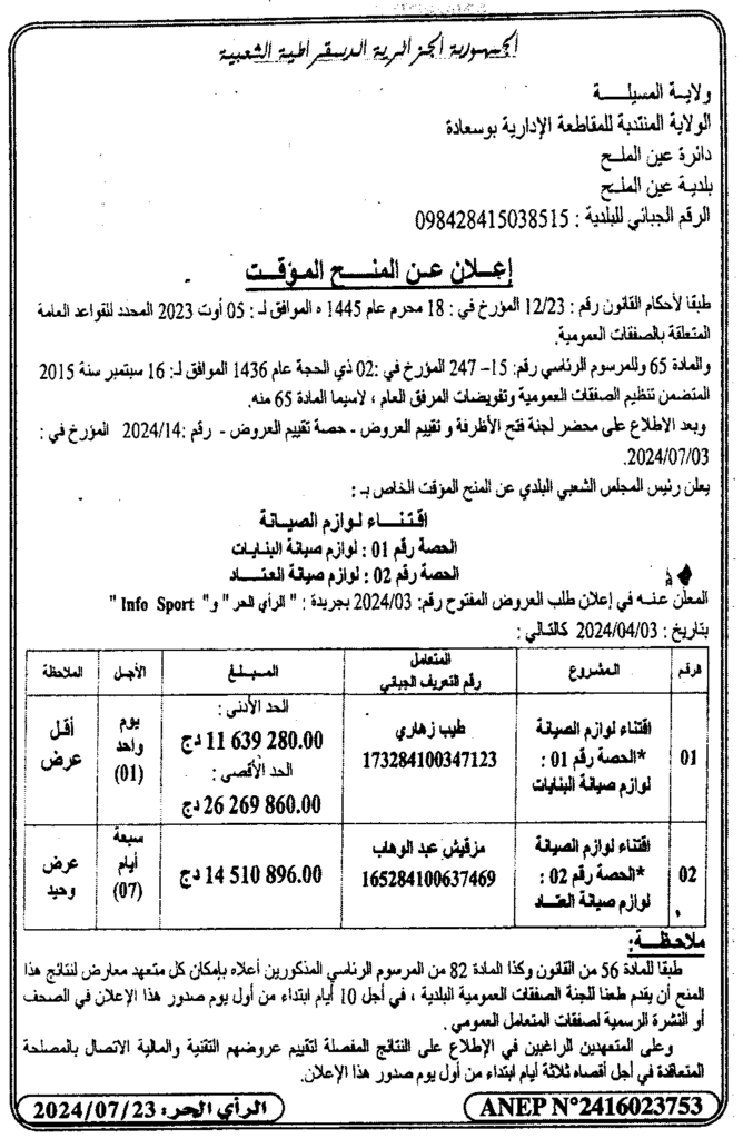 إعلان عن منح مؤقت اقتناء لوازم الصيانة/ بلدية عين الملح