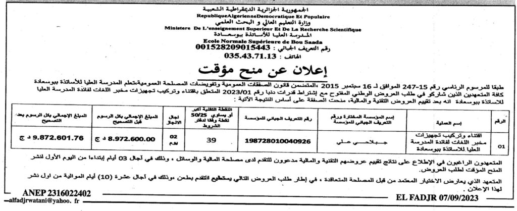 إعلان عن منح مؤقت: اقتناء وتركيب تجهيزات مخبر اللغات لفائدة المدرسة العليا للأساتذة ببوسعادة