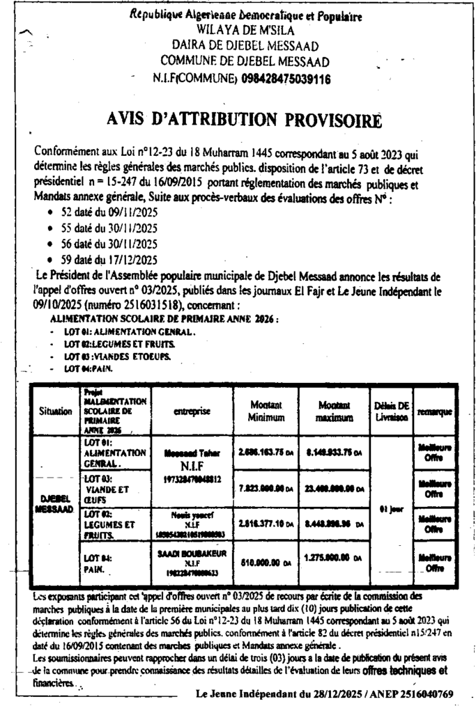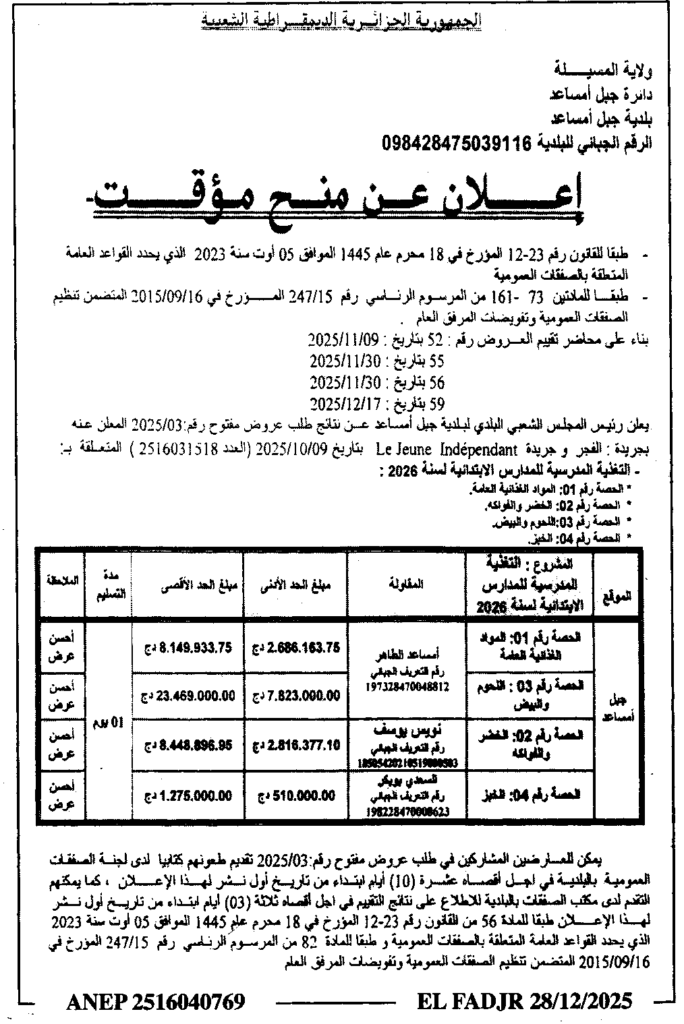 إعلان عن منح مؤقت التغذية المدرسية للمدارس الابتدائية 2026/ بلدية جبل امساعد