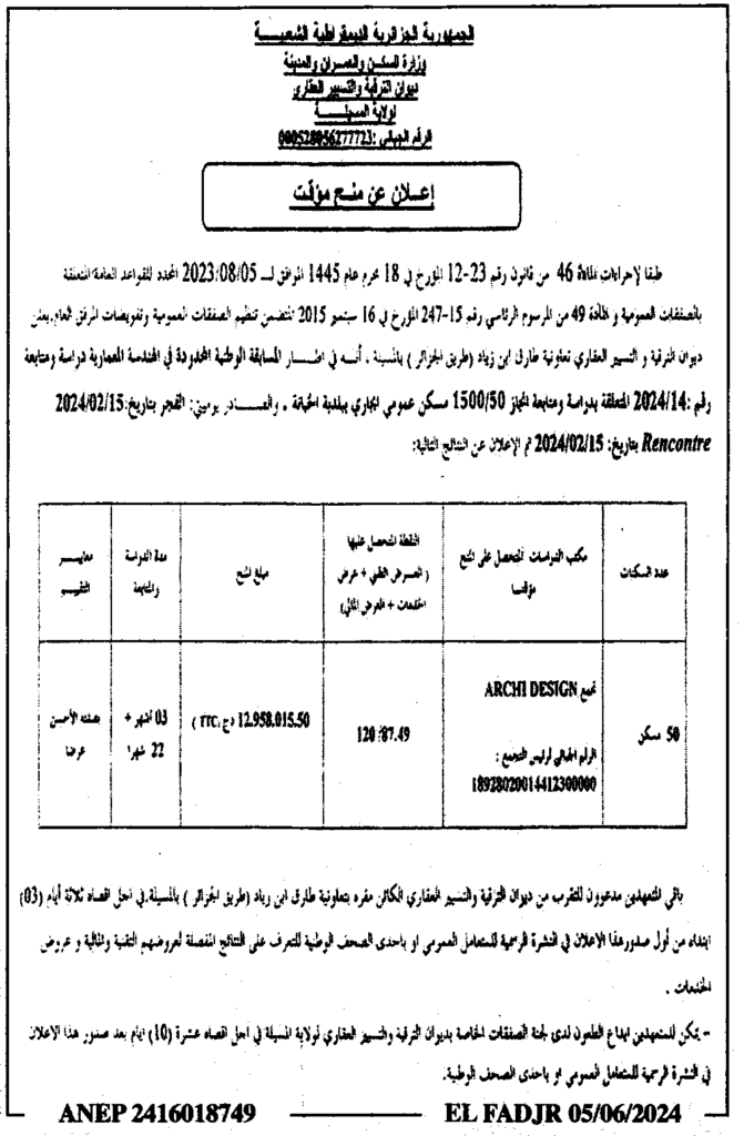 إعلان عن منح مؤقت: المسابقة الوطنية المحدودة في الهندسة المعمارية لدراسة ومتابعة رقم 2024/14 لدراسة متابعة انجاز 1500/50 مسكن عمومي ايجاري ببلدية الخبانة/ ديوان الترقية والتسيير العقاري لولاية المسيلة