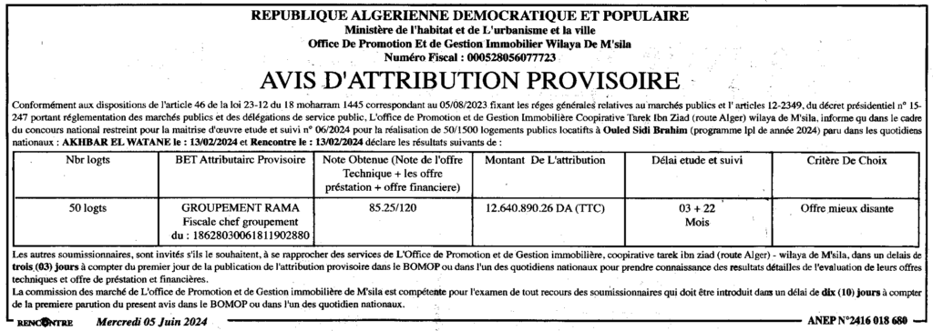 إعلان عن منح مؤقت: المسابقة الوطنية المحدودة في الهندسة المعمارية لدراسة ومتابعة رقم 2024/06 لدراسة متابعة انجاز 1500/50 مسكن عمومي ايجاري ببلدية أولاد سيدي ابراهيم برنامج LPL لسنة 2024/ ديوان الترقية والتسيير العقاري لولاية المسيلة