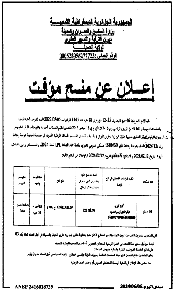 إعلان عن منح مؤقت: المسابقة الوطنية المحدودة في الهندسة المعمارية لدراسة ومتابعة رقم 2024/12 لدراسة متابعة انجاز 1500/50 مسكن عمومي ايجاري ببلدية حمام الضلعة/ ديوان الترقية والتسيير العقاري لولاية المسيلة