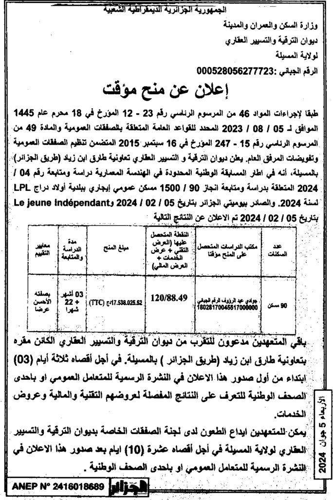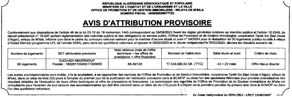 إعلان عن منح مؤقت: المسابقة الوطنية المحدودة في الهندسة المعمارية لدراسة ومتابعة رقم 2024/04 لانجاز 1500/90 مسكن عمومي ايجاري ببلدية أولاد دراج LPL لسنة 2024/ ديوان الترقية والتسيير العقاري لولاية المسيلة