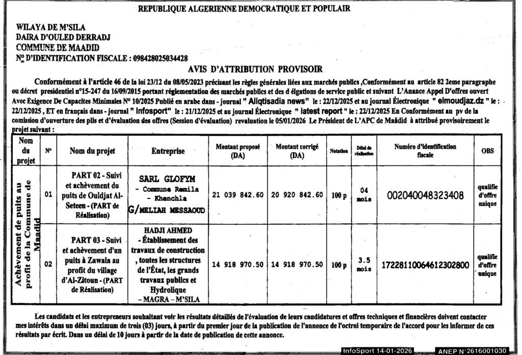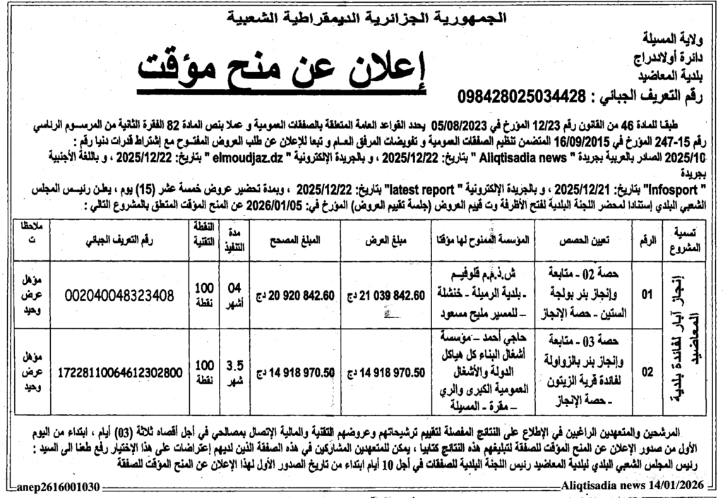 إعلان عن منح مؤقت انجاز آبار/ بلدية المعاضيد