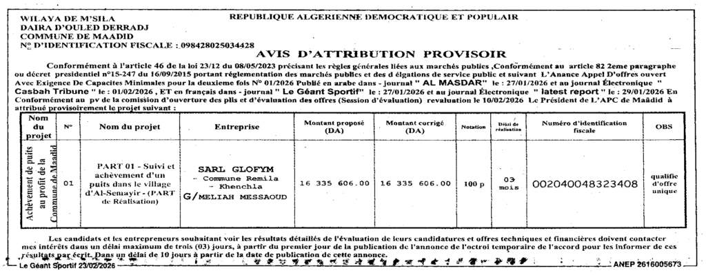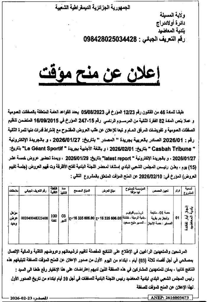 إعلان عن منح مؤقت انجاز آبار/ بلدية المعاضيد