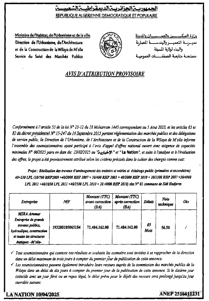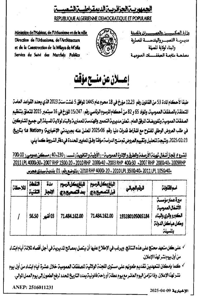إعلان عن منح مؤقت انجاز أشغال تهيئة الأرصفة والطرق والإنارة العمومية/ مديرية التعمير والهندسة المعمارية والبناء لولاية المسيلة