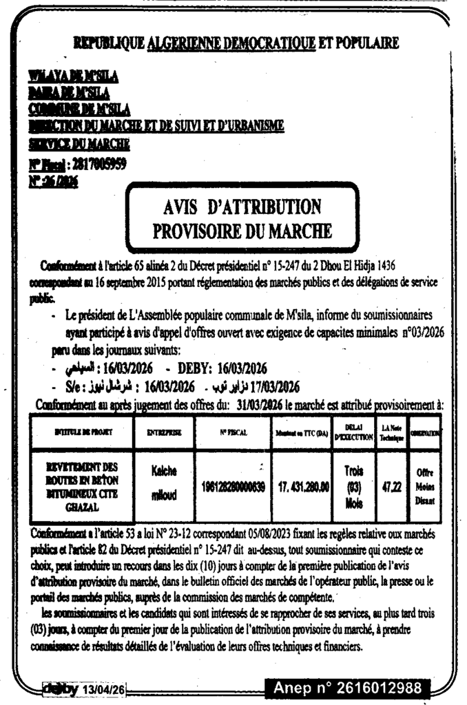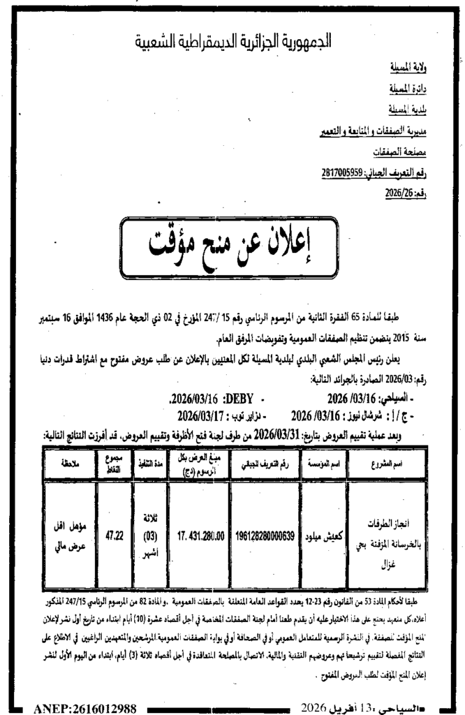 إعلان عن منح مؤقت انجاز الطرقات بالخزانة المزفتة/ بلدية المسيلة
