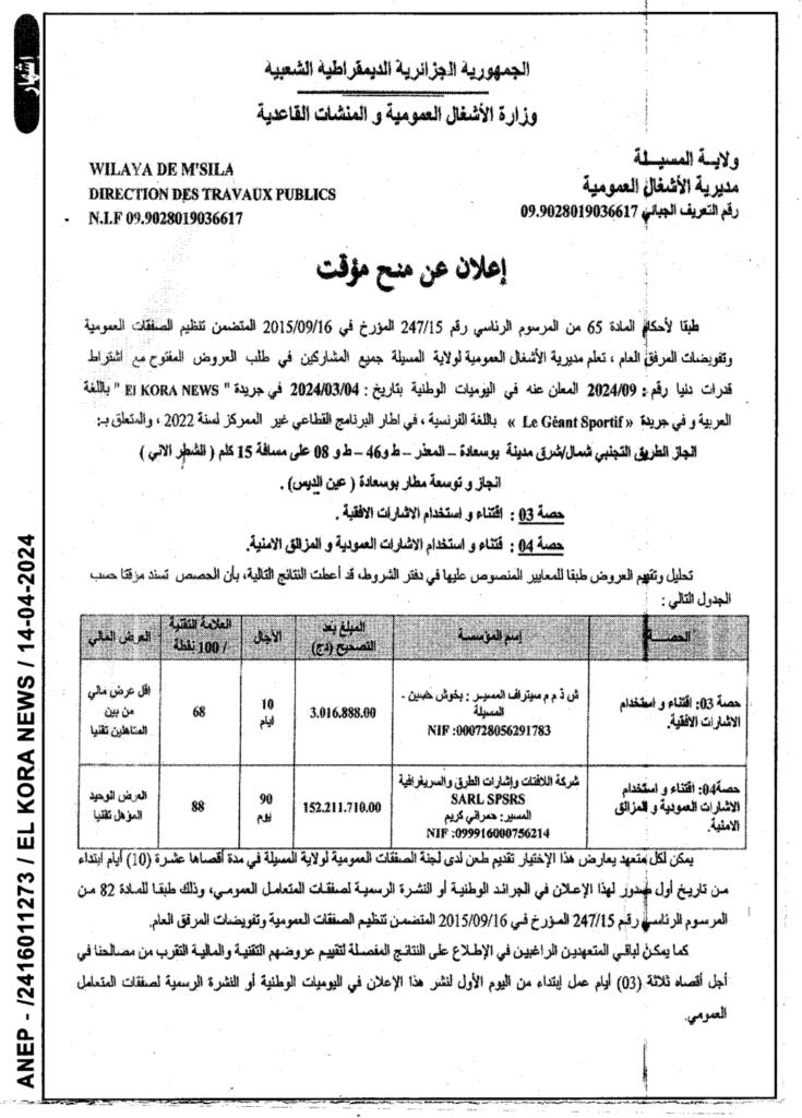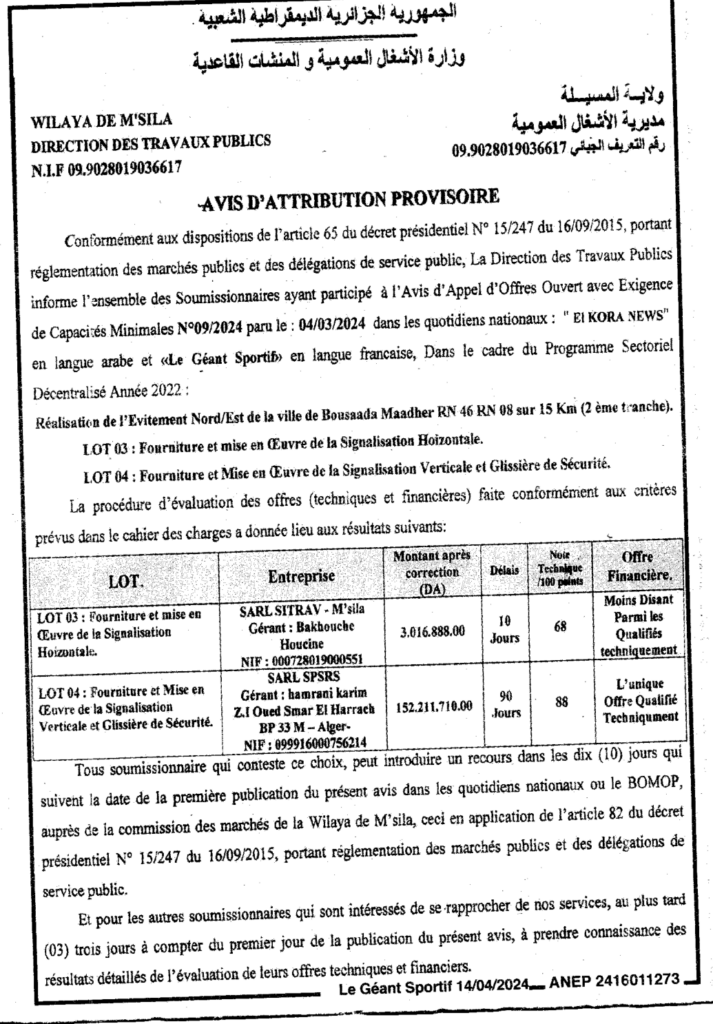 إعلان عن منح مؤقت: انجاز الطريق التجنبي شمال/شرق مدينة بوسعادة المعذر ط و 46- ط و 08 على مسافة 15 كلم / مديرية الأشغال العمومية لولاية المسيلة