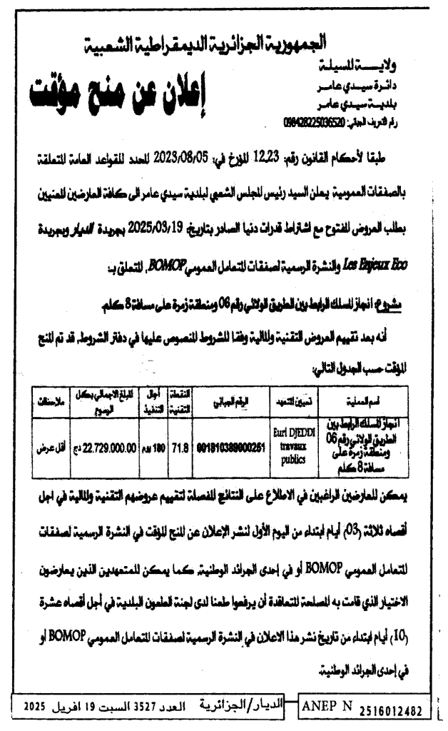 إعلان عن منح مؤقت انجاز المسلك الرابط بين الطريق الولائي رقم 06 ومنطقة زمرة على مسافة 08 كلم/ بلدية سيدي عامر