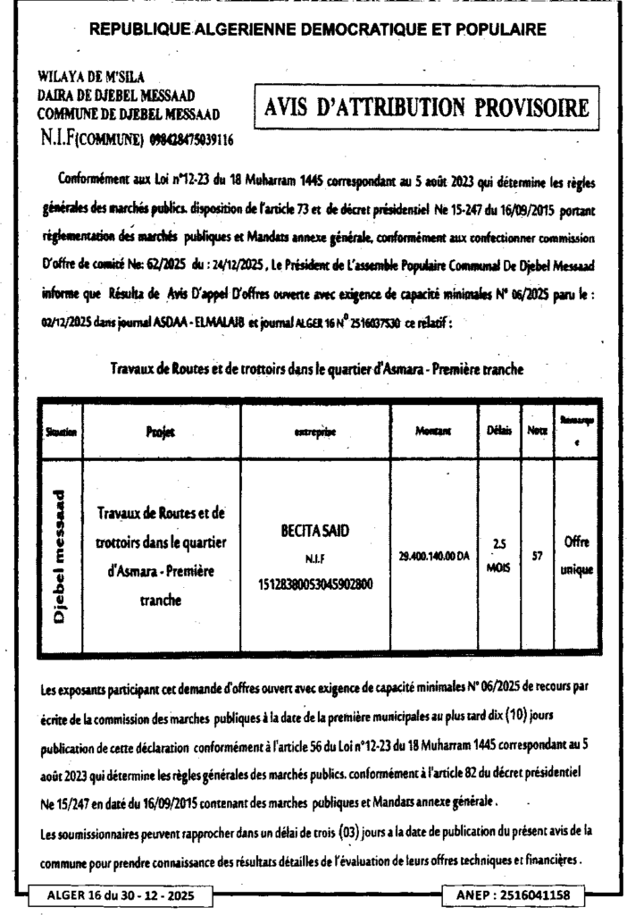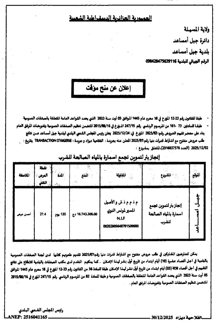 إعلان عن منح مؤقت انجاز بئر لتموين تجمع اسمارة بالمياه الصالحة للشرب/ بلدية جبل امساعد
