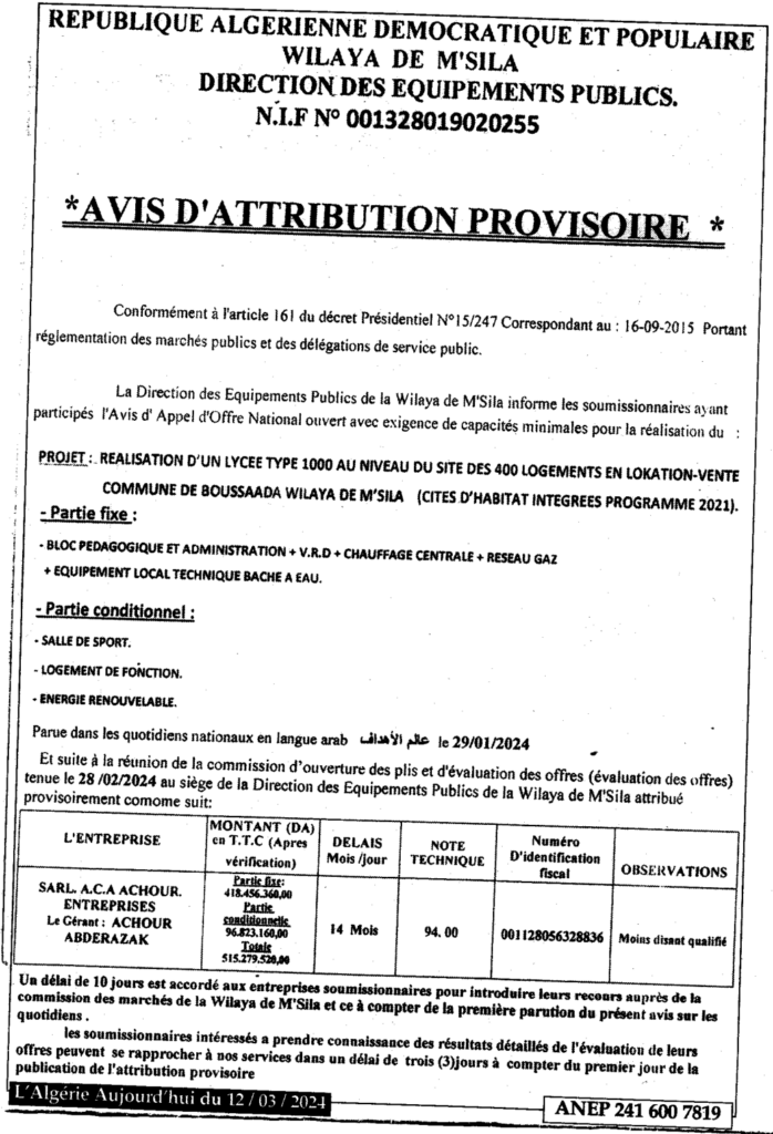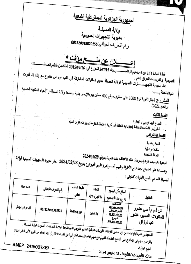 إعلان عن منح مؤقت: انجاز ثانوية نوع 1000 على مستوى موقع 400 مسكن بيع بالايجار بلدية بوسعادة/ مديرية التجهيزات العمومية لولاية المسيلة
