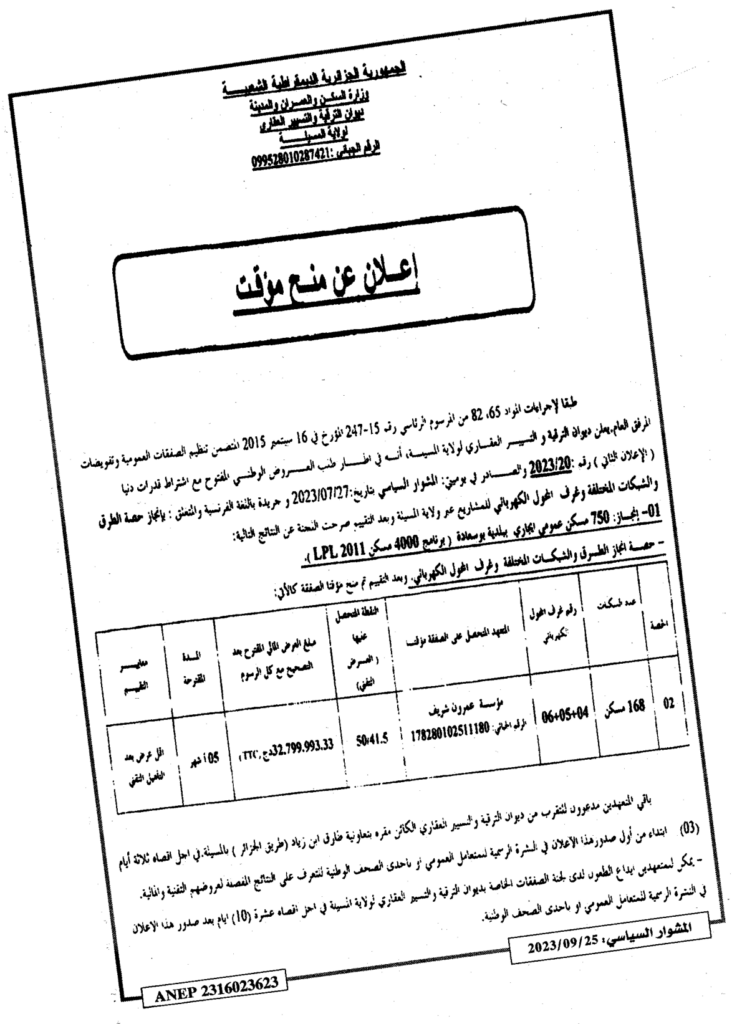 إعلان عن منح مؤقت: انجاز حصة الطرق والشبكات المختلفة وغرف المحول الكهربائي للمشاريع عبر ولاية المسيلة