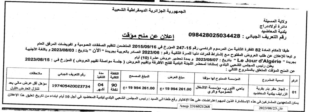 إعلان عن منح مؤقت: انجاز حفر بئر بقرية الزرايف ببلدية المعاضيد