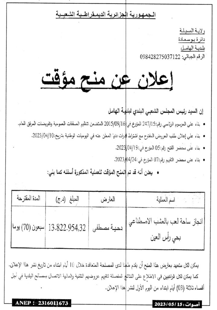 إعلان عن منح مؤقت: انجاز ساحة لعب بالعشب الاصطناعي بحي رأس العين/ بلدية الهامل