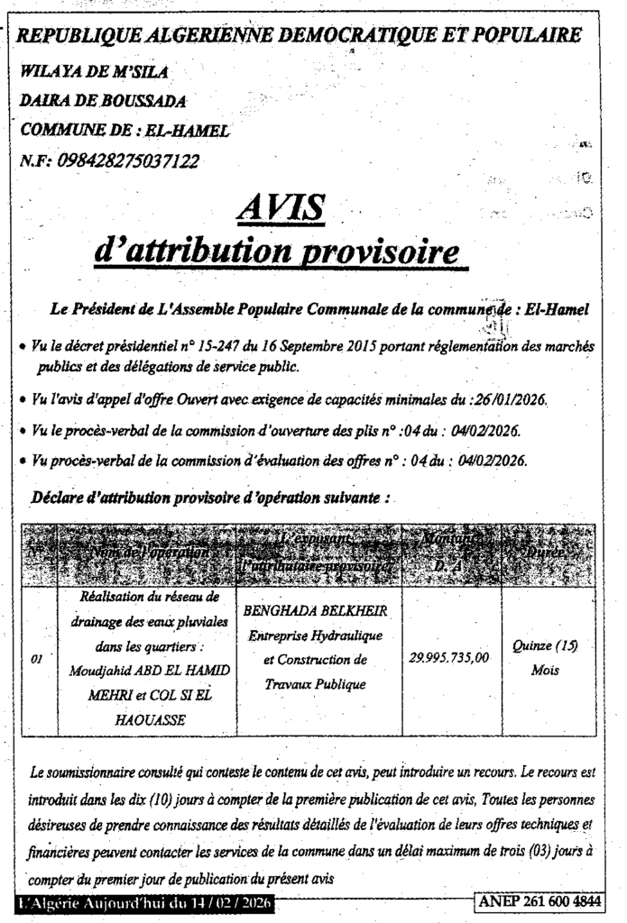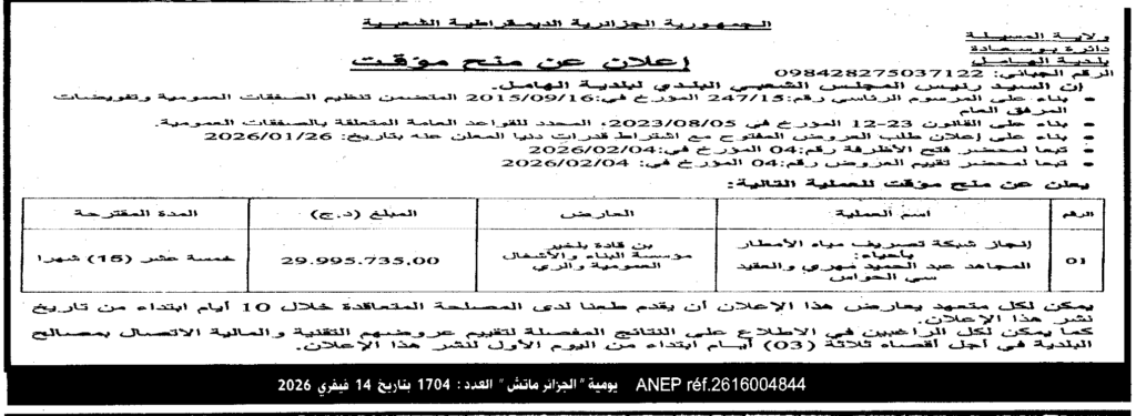 إعلان عن منح مؤقت انجاز شبكة تصريف مياه الأمطار/ بلدية الهامل