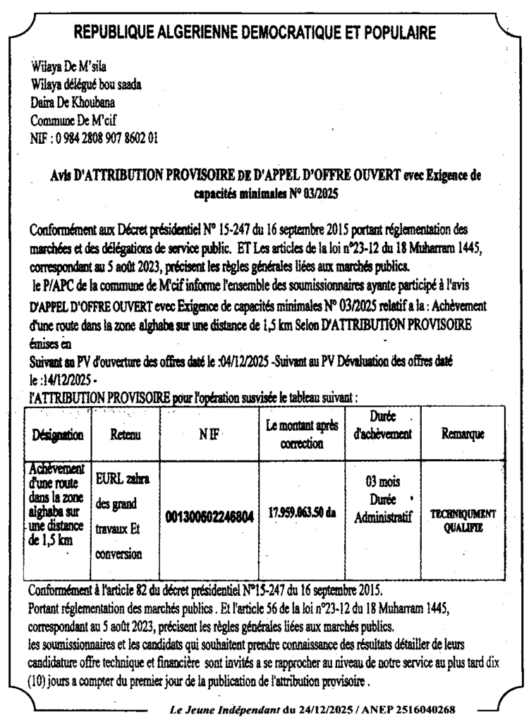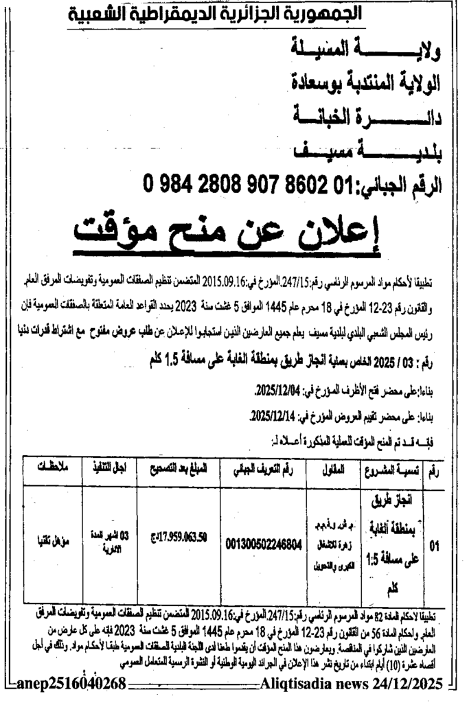 إعلان عن منح مؤقت انجاز طريق بمنطقة الغابة على مسافة 1.5 كلم/ بلدية مسيف