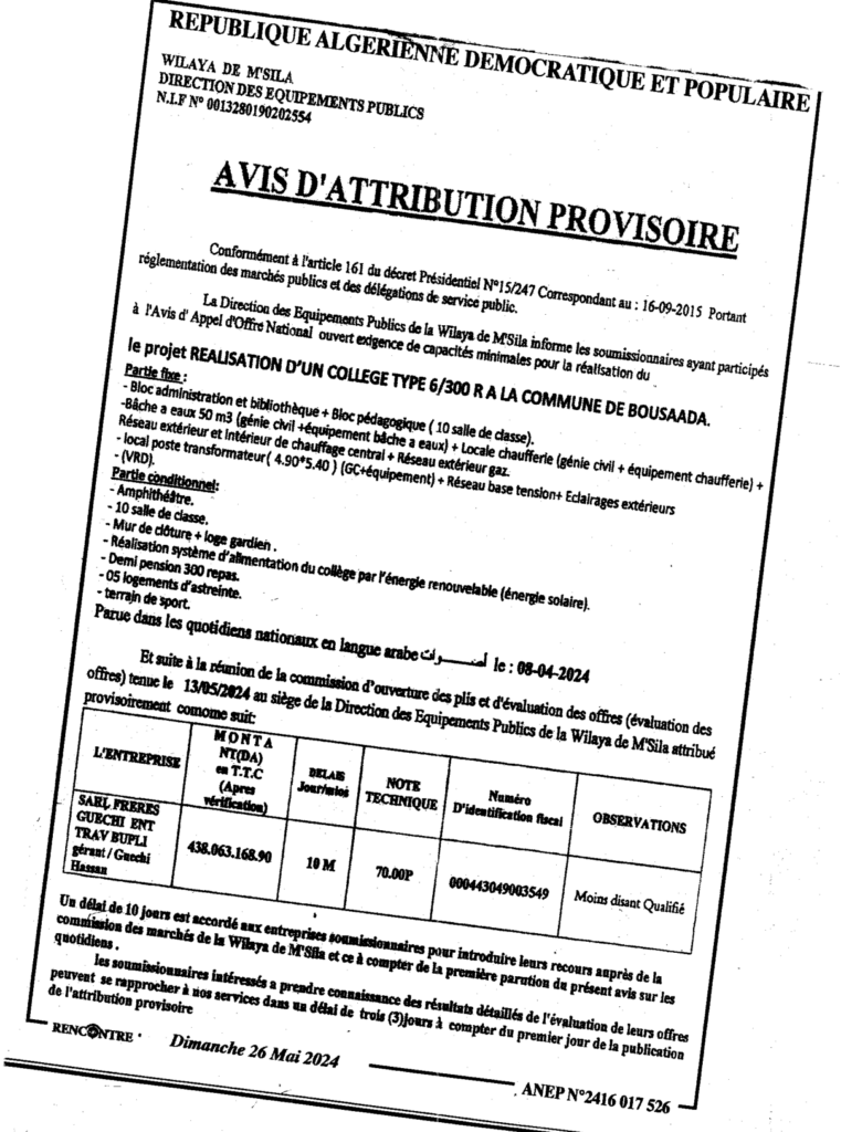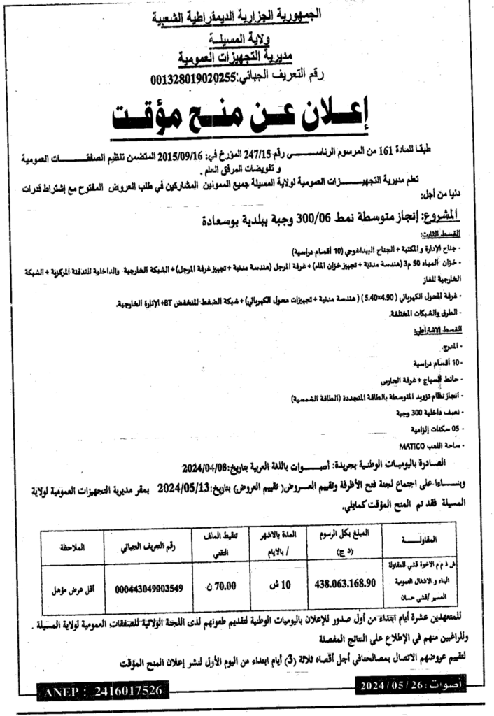 إعلان عن منح مؤقت انجاز متوسطة نمط 300/06 وجبة ببلدية بوسعادة/ مديرية التجهيزات العمومية لولاية المسيلة