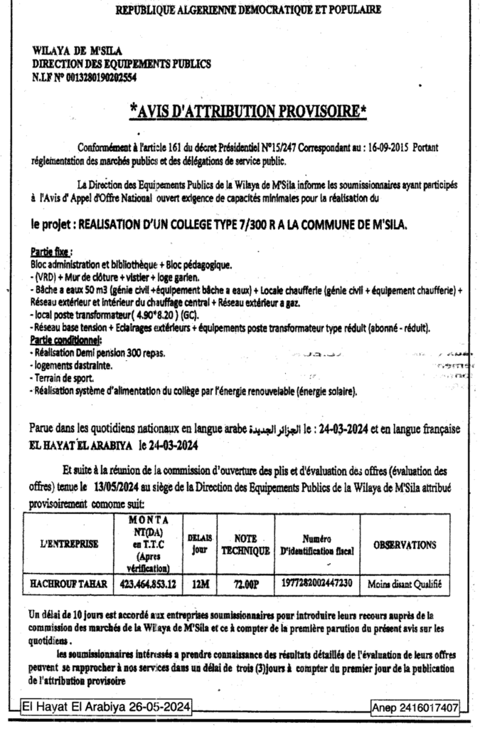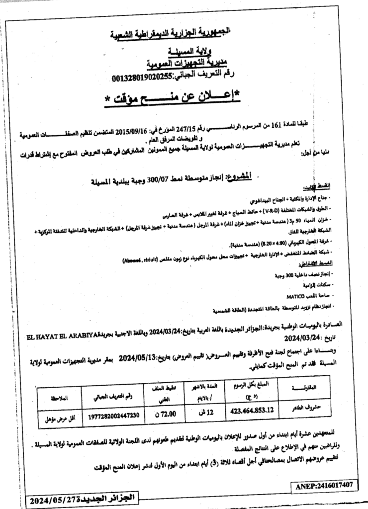 إعلان عن منح مؤقت انجاز متوسطة نمط 300/07 وجبة ببلدية المسيلة/ مديرية التجهيزات العمومية لولاية المسيلة