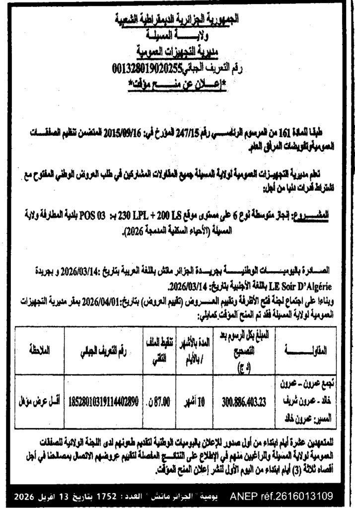 إعلان عن منح مؤقت انجاز متوسطة نوع 06 على مستوى موقع LS 200 بـ POS 03 بلدية المطارفة/ مديرية التجهيزات العمومية لولاية المسيلة