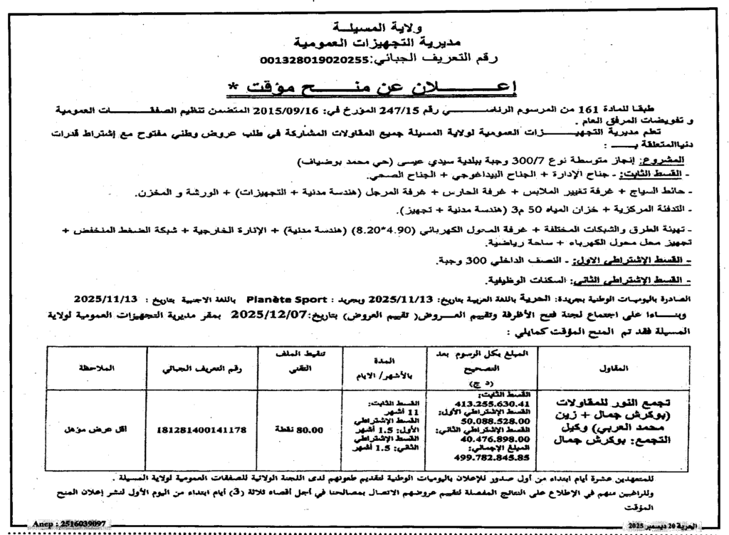 إعلان عن منح مؤقت انجاز متوسطة نوع 300/7 وجبة ببلدية سيدي عيسى/ مديرية التجهيزات العمومية لولاية المسيلة