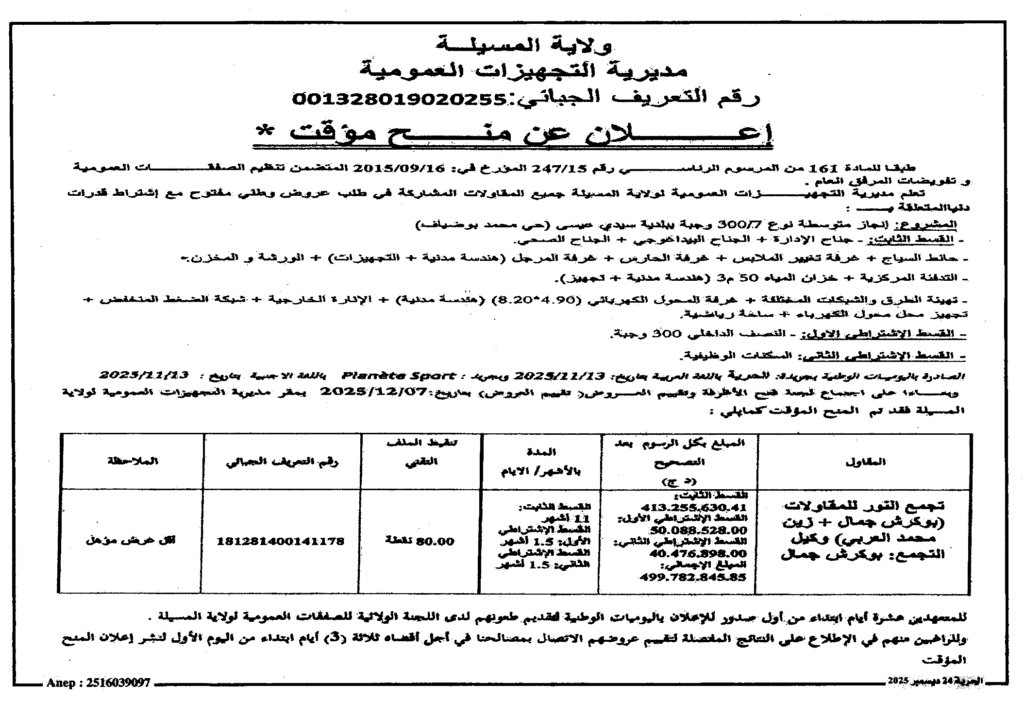 إعلان عن منح مؤقت انجاز متوسطة نوع 300/7 وجبة بلدية سيدي عيسى/ مديرية التجهيزات العمومية لولاية المسيلة