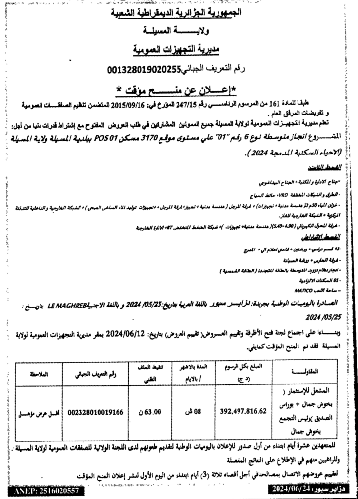 إعلان عن منح مؤقت انجاز متوسطة نوع 6 رقم 01 على مستوى موقع 3170 مسكن 01 POS بلدية المسيلة/ مديرية التجهيزات العمومية لولاية المسيلة
