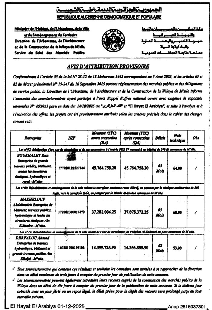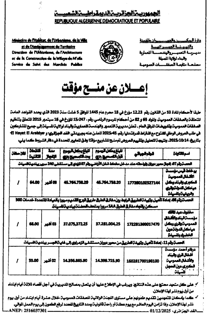 إعلان عن منح مؤقت انجاز محور الدوران ولواحقه واعادة تهيئة الطريق ببلدية المسيلة/ مديرية التعمير والهندسة المعمارية والبناء لولاية المسيلة