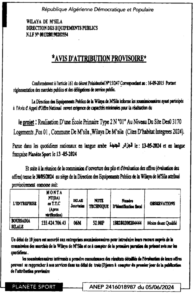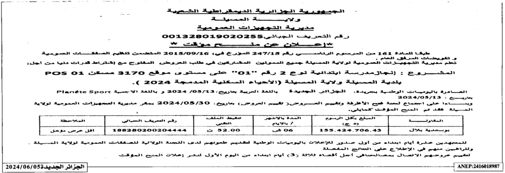 إعلان عن منح مؤقت: انجاز مدرسة ابتدائية نوع 02 رقم 01 على مستوى موقع 3170 مسكن POS 01 بلدية المسيلة (الأحياء السكنية المدمجة 2024)/ مديرية التجهيزات العمومية لولاية المسيلة
