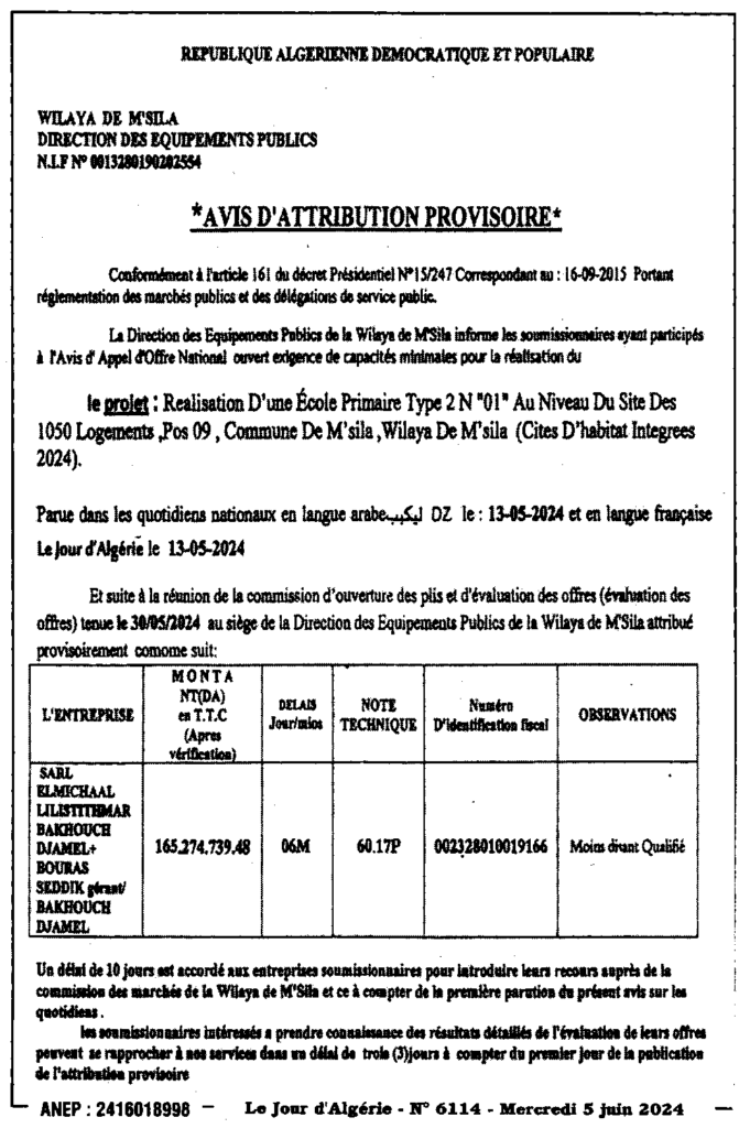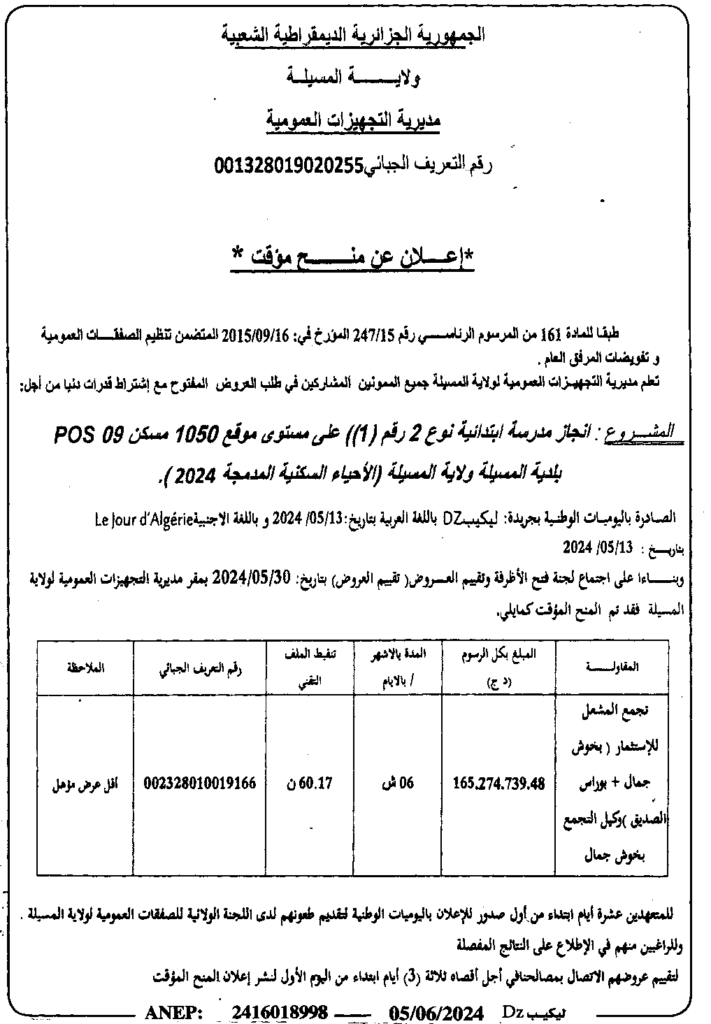 إعلان عن منح مؤقت: انجاز مدرسة ابتدائية نوع 02 رقم 01 على مستوى موقع 1050 مسكن POS 09 بلدية المسيلة (الأحياء السكنية المدمجة 2024)/ مديرية التجهيزات العمومية لولاية المسيلة