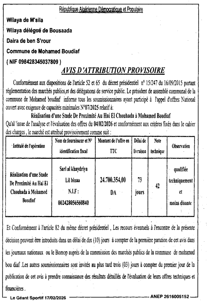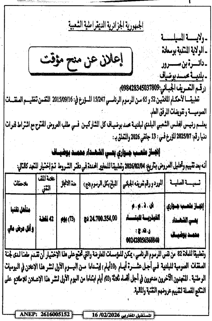 إعلان عن منح مؤقت انجاز ملعب جواري بحي الشهداء/ بلدية محمد بوضياف