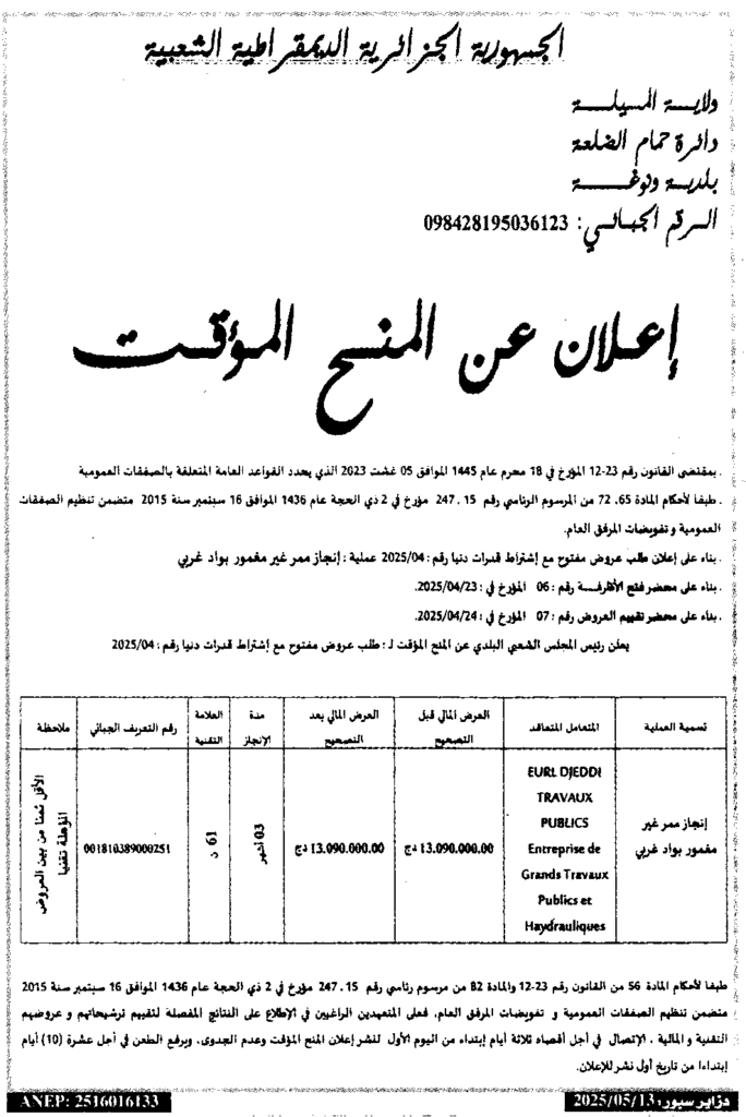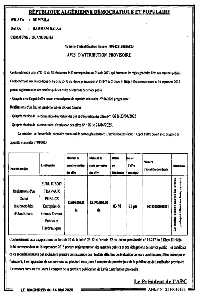 إعلان عن منح مؤقت انجاز ممر غير مغمور بواد غربي/ بلدية ونوغة