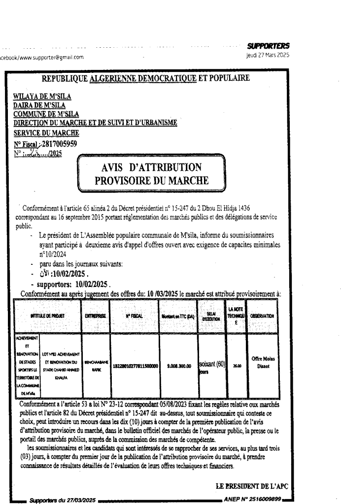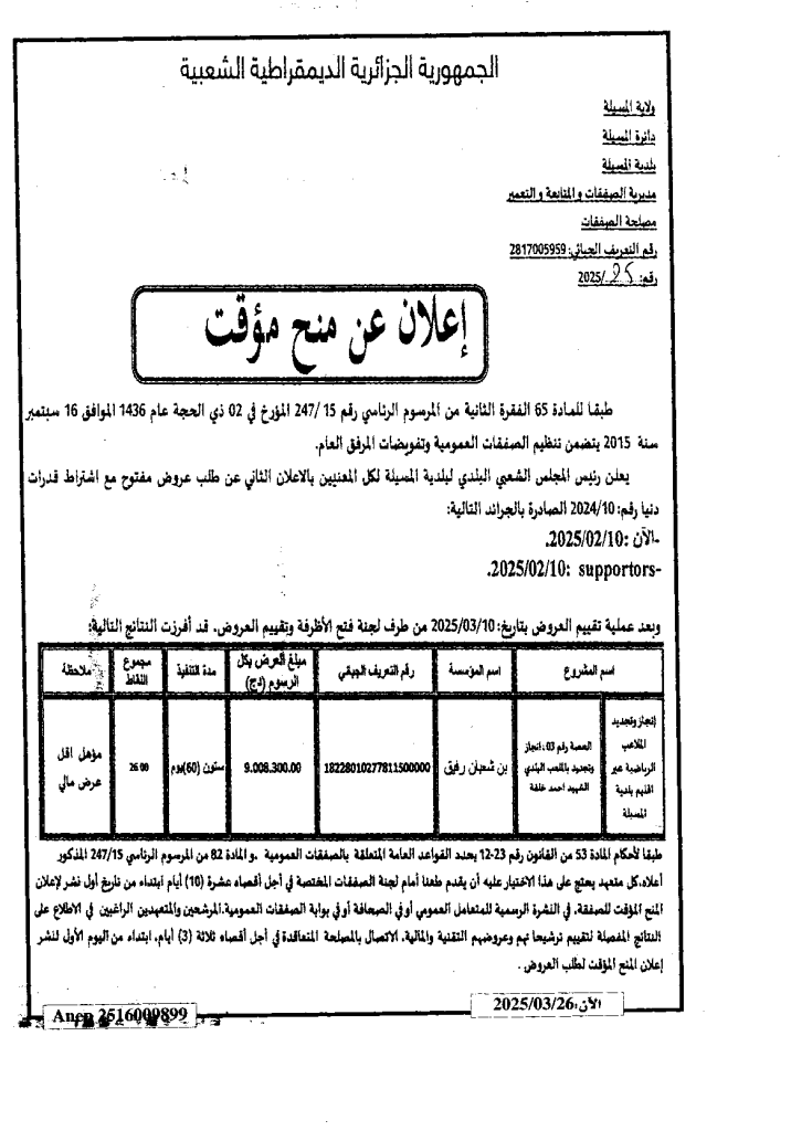 إعلان عن منح مؤقت انجاز وتجديد الملاعب الرياضية عبر اقليم بلدية المسيلة