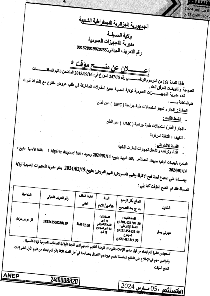 إعلان عن منح مؤقت: انجاز وتجهيز استعجالات طبية جراحية (UMC) عين الملح/ مديرية التجهيزات العمومية