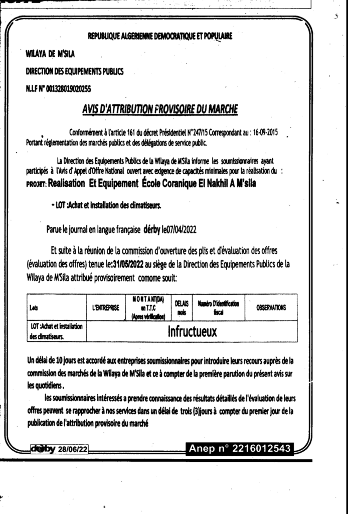 إعلان عن منح مؤقت: انجاز وتجهيز مدرسة قرآنية النخيل بالمسيلة مديرية التجهيزات العمومية