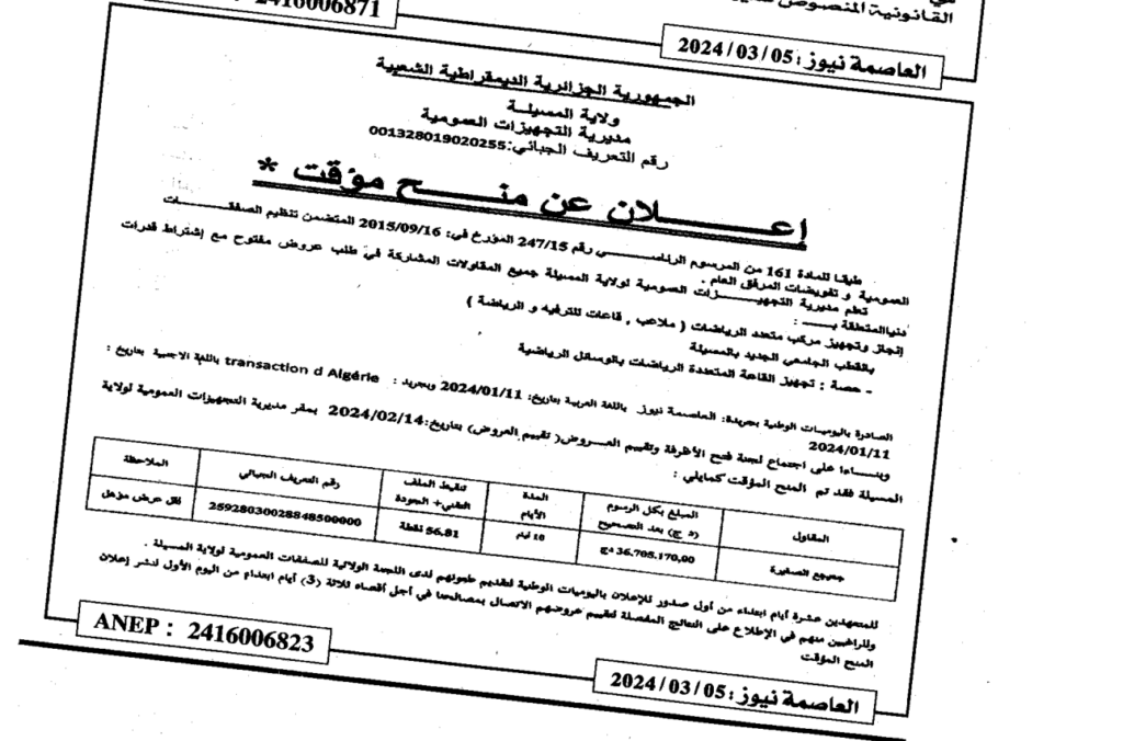 إعلان عن منح مؤقت: انجاز وتجهيز مركب متعدد الرياضات (ملاعب، قاعات للترفيه والرياضة)