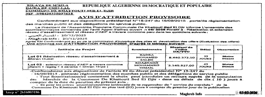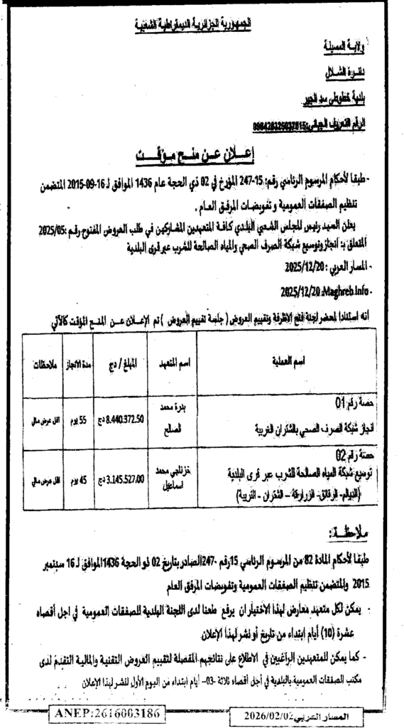 إعلان عن منح مؤقت انجاز وتوسيع شبكة الصرف الصحي والمياه الصالحة للشرب عبر قرى البلدية/ بلدية خطوطي سد الجير