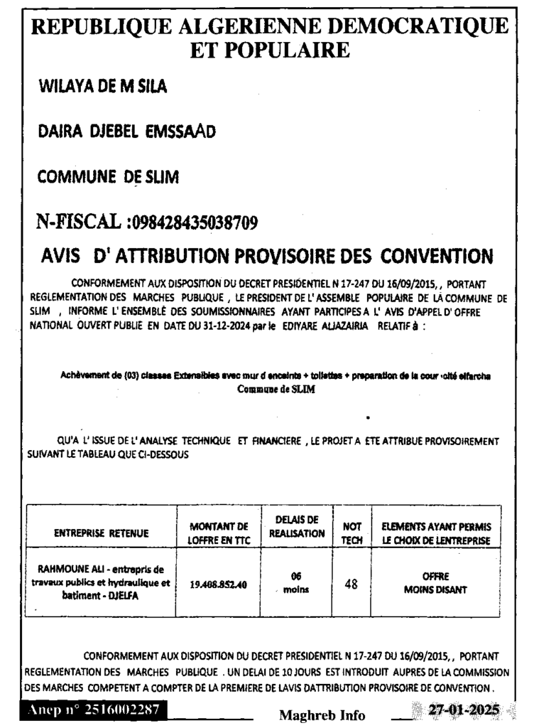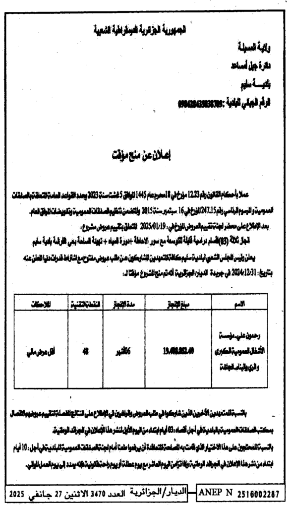 إعلان عن منح مؤقت انجاز 03 أقسام دراسية قابلة للتوسعة/ بلدية سليم