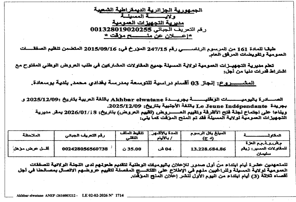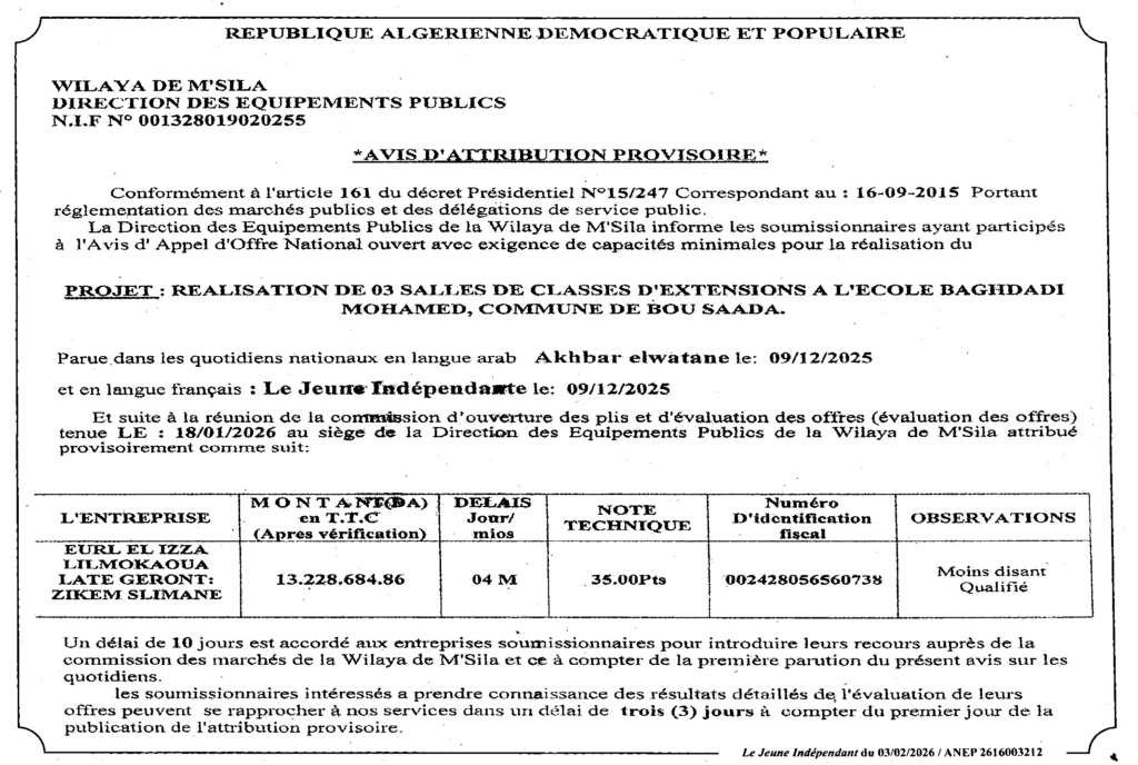 إعلان عن منح مؤقت انجاز 03 أقسام دراسية للتوسعة بلدية بوسعادة/ مديرية التجهيزات العمومية لولاية المسيلة