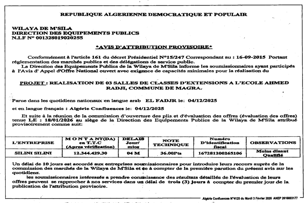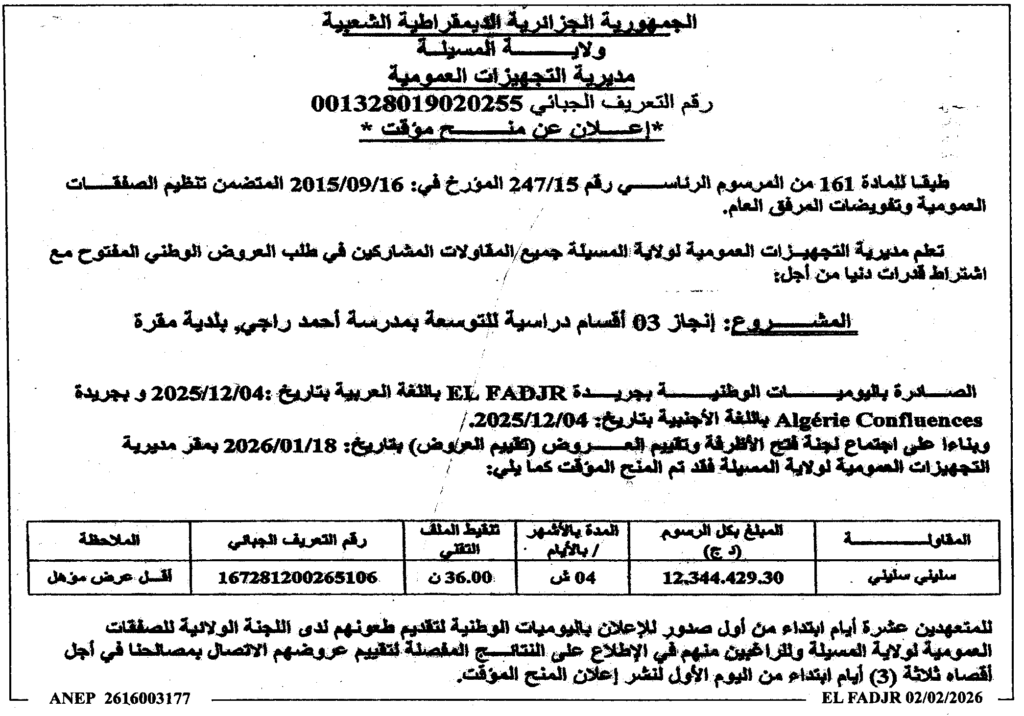 إعلان عن منح مؤقت انجاز 03 أقسام دراسية للتوسعة بلدية مقرة/ مديرية التجهيزات العمومية لولاية المسيلة