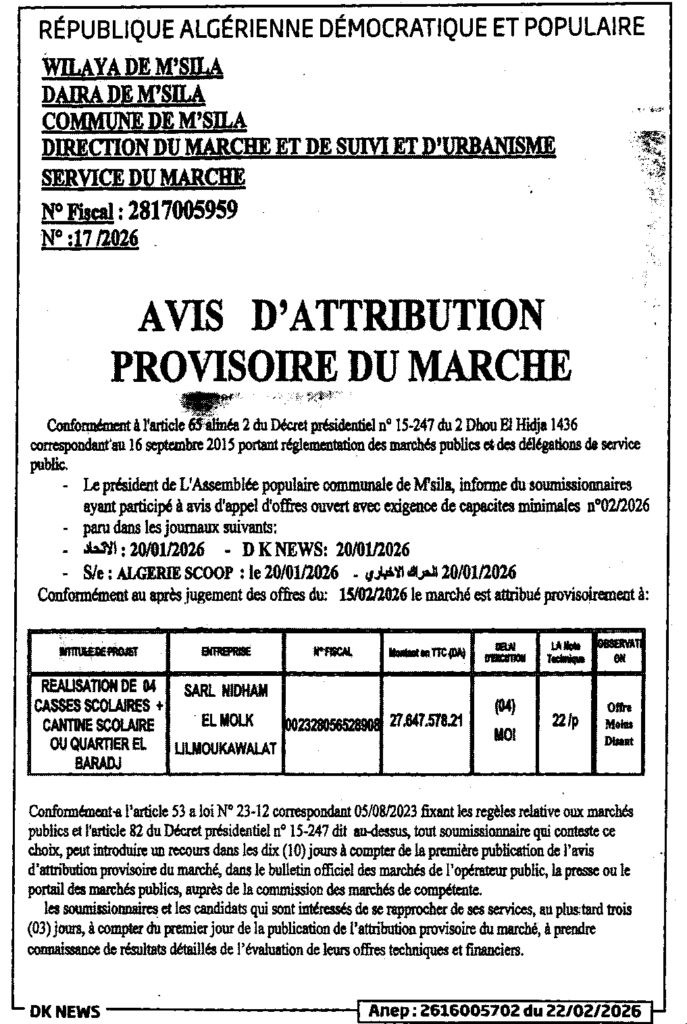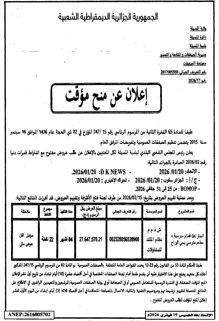 إعلان عن منح مؤقت انجاز 04 أقسام مدرسية + مطعم مدرسي/ بلدية المسيلة