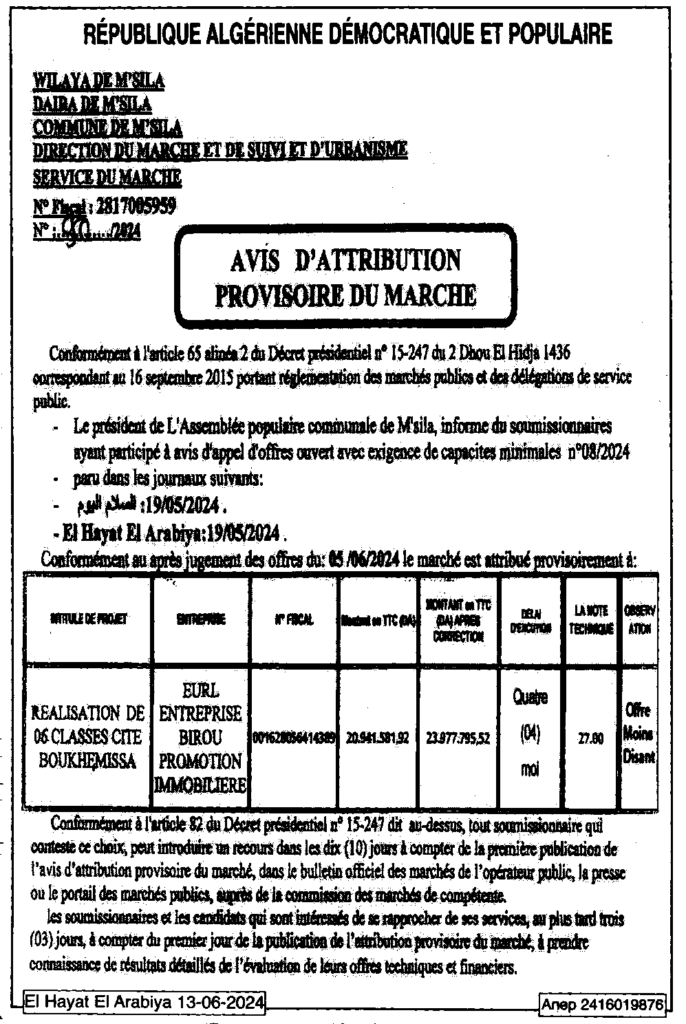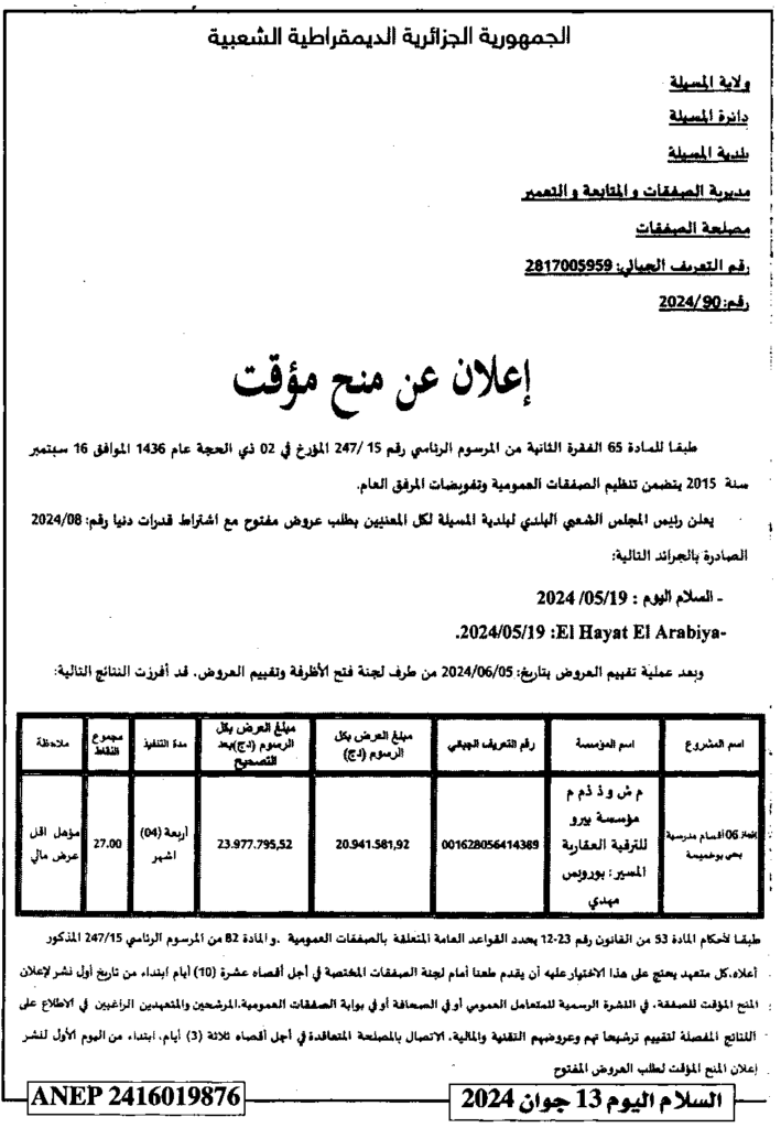 إعلان عن منح مؤقت انجاز 06 أقسام مدرسية بحي بوخميسة ببلدية المسيلة