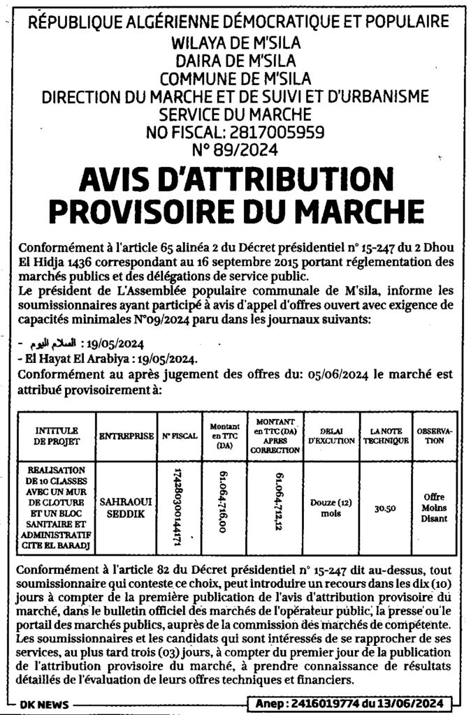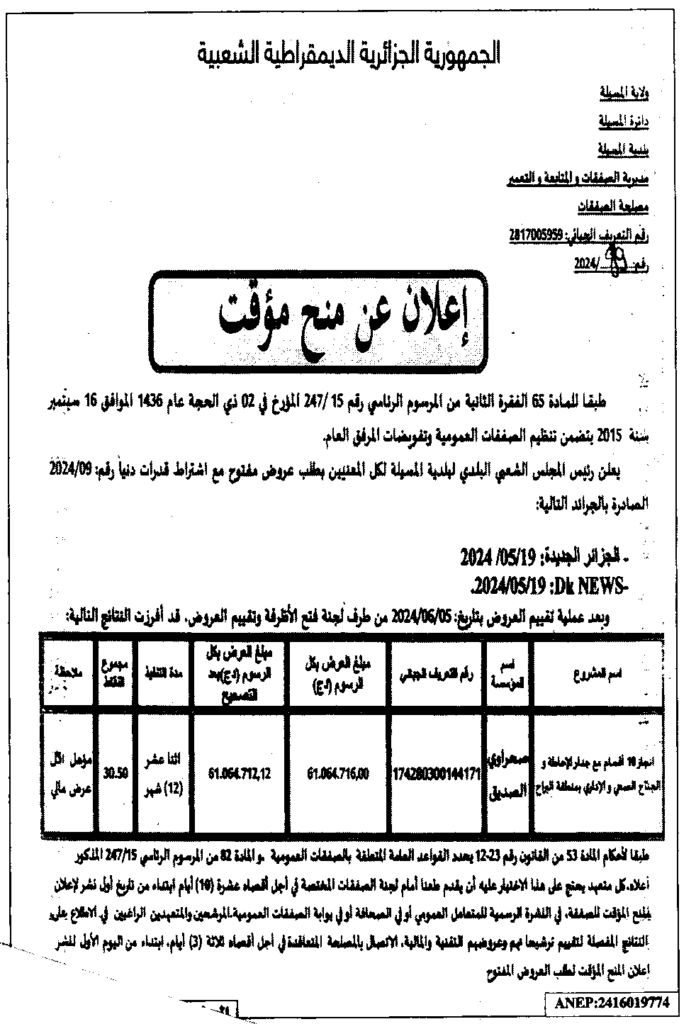 إعلان عن منح مؤقت انجاز 10 أقسام مع جدار الاحاطة/ بلدية المسيلة