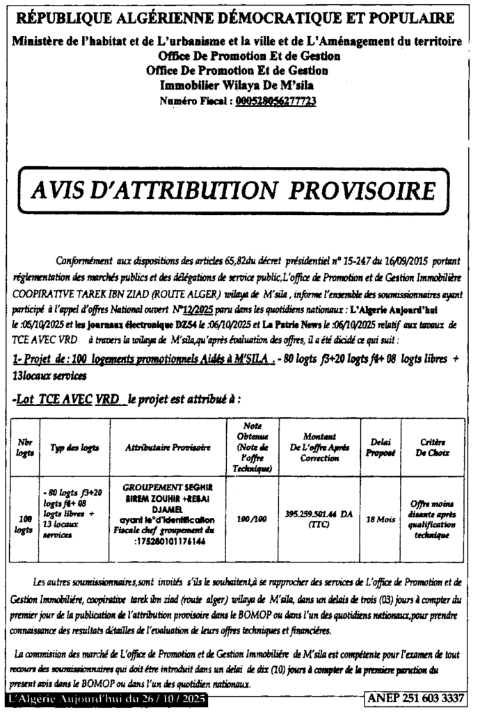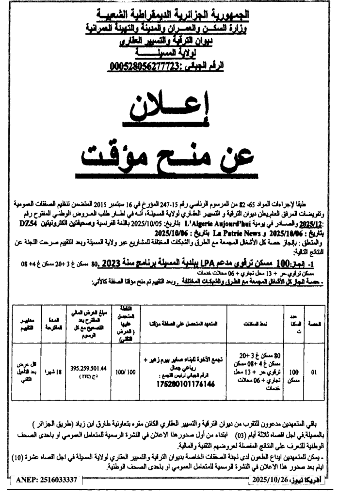 إعلان عن منح مؤقت انجاز 100 مسكن ترقوي مدعم LPA ببلدية المسيلة/ ديوان الترقية والتسيير العقاري لولاية المسيلة