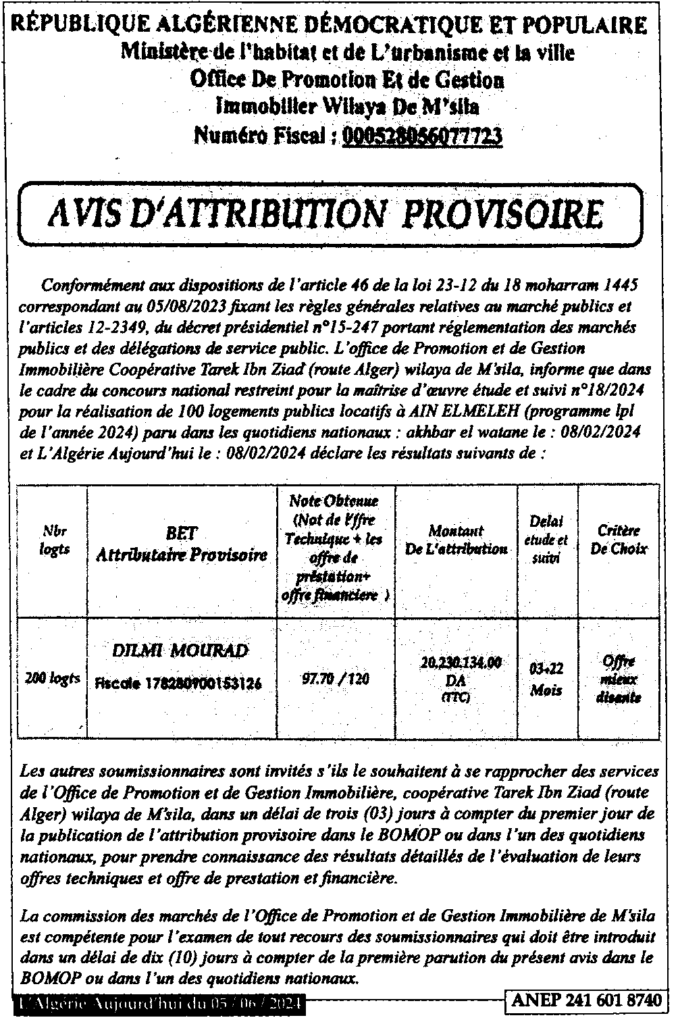 إعلان عن منح مؤقت: انجاز 100 مسكن عمومي ايجاري ببلدية عين الملح LPL لسنة 2024/ ديوان الترقية والتسيير العقاري لولاية المسيلة