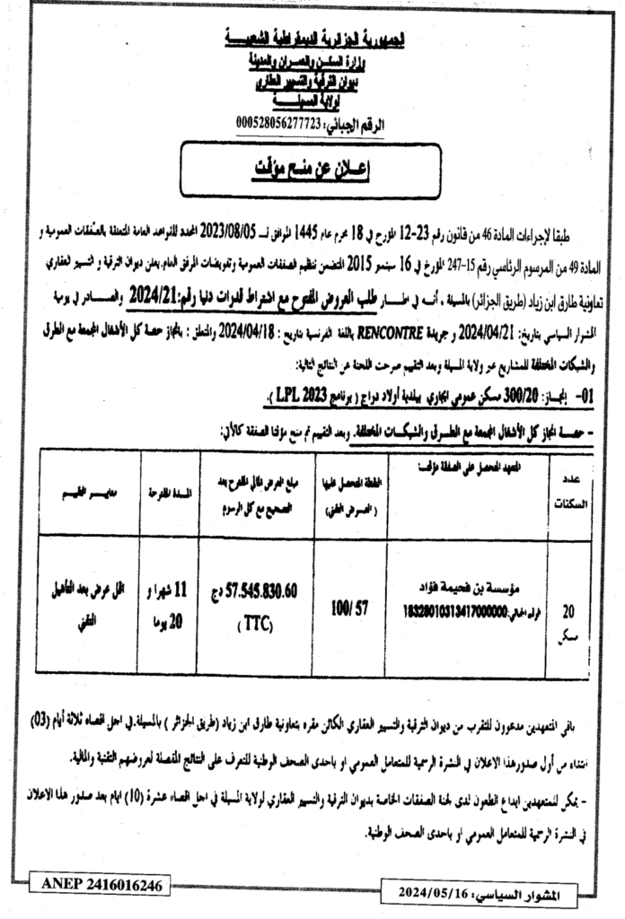 إعلان عن منح مؤقت انجاز 300/20 مسكن عمومي ايجاري ببلدية أولاد دراج/ ديوان الترقية والتسيير العقاري لولاية المسيلة